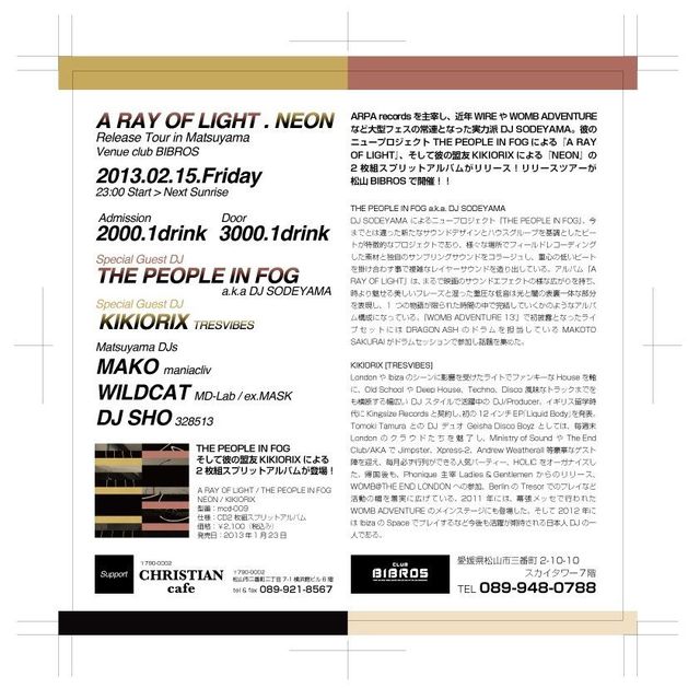 彼のニュープロジェクト THE PEOPLE IN FOGによる[A RAY OF LIGHT]、そして彼の盟友KIKORIXによる[NEON]の2枚組スプリットアルバムがリリース!