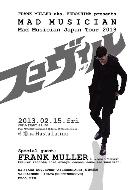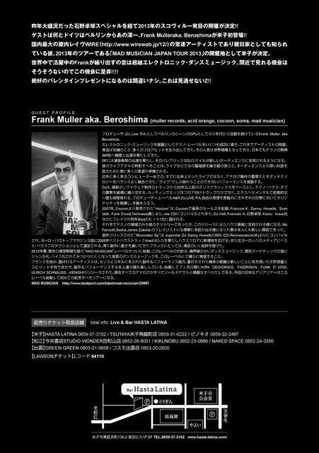 管理人様告知失礼致します。 「スコヴィルvol.7」 昨年大盛況だった石野卓球スペシャルを経て2013年のスコヴィル一発目の開催が決定!! ゲストは何とドイツはベルリンからあの漢ー、Frank Mulleraka. Beroshimaが米子初登場!! 国内最大の屋内レイヴWIRE(http://www.wireweb.jp/12/)の常連アーティストであり 親日家としても知られている彼。 2013年のツアーである「MAD MUSICIAN JAPAN TOUR 2013」の開催地として米子が決定。 世界中で活躍中のFrankが繰り出すの音は超越エレクトロニック・ダンスミュージック。 間近で