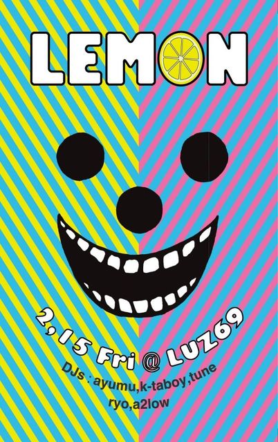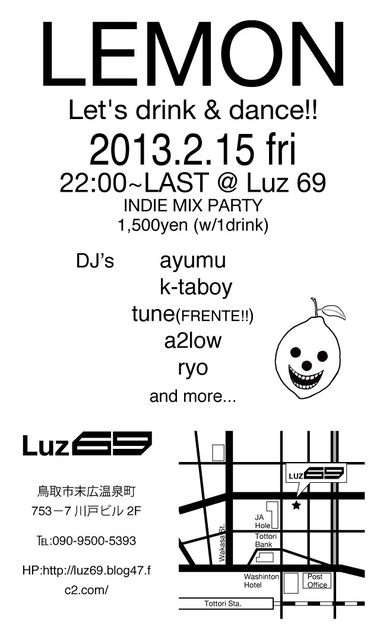 LEMON [indie mix party] ■2013.02.15(Fri) ■22:00〜LAST ■@Luz69 ■DOOR 1,500yen(w/1drink) ■DJ's ayumu / k-taboy / tune(FRENTE!!) / a2low / ryo / kuri / and more… ■Special Guest DJ 2bn (play on from 名古屋) indie party 「LEMON」遂にall nightで開催します! 今回から「FRENTE!!」中心に松江で活躍するtuneがメンバーに加入。 ゲストは名古屋の大人気イベント「play on」主宰、坪内克徳改め2bnさんが参戦。 ここ山陰の地で、どんな超絶indie mixを披露するのか乞うご期待です! そしていつ