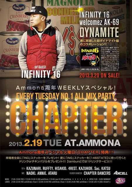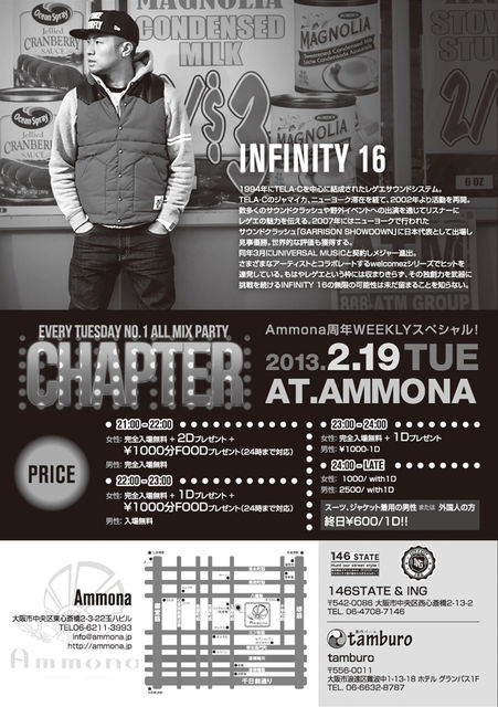 告知失礼します! INFINITY 16出演告知させて頂きます! いよいよ明日は、2/19(火)CLUB AMMONAで毎週火曜日開催中のCHAPTER(チャプター)にSPゲストにINFINITY 16 が決定!是非予定を空けておいてくださいね〜(`_´)ゞ 【緊急特典】2月19日(火)CHAPTER SP特典!先着100名様にSP GUESTのINIFINITY16 DUB MIX CDをプレゼント!当日SP特典GETしてCHAPTER SPを楽しんで下さい♫ <INFINITY 16 -TELA-C-> 1994年にTELA-Cを中心に結成されたレゲエサウンドシステム。TELA-Cのジャマイカ、ニューヨーク滞在を経て、2002年より活動を再開