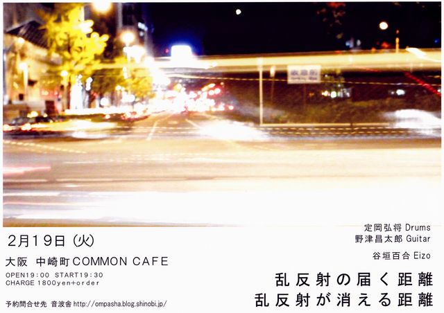 『乱反射の届く距離 乱反射が消える距離』 2013.2/19(火) 19:00open 19:30start ¥1800 (ドリンク別) 出演: 定岡弘将 drums http://undermine.seesaa.net/ 野津昌太郎 guitar http://nozzlive.exblog.jp/ 谷垣百合 image http://yuritanigaki.com/ ♪ 音楽のための映像でなく。また、映像の為の音楽でもない。 そしてそれらが調和や重なり混じりあうことは期待していない。いや、むしろ望まない。ただ同じ空間に音と光と影があるだけであり、それ以外になんの現象も意味もない。 『原野に雨が降り、わずかな窪みに水がた