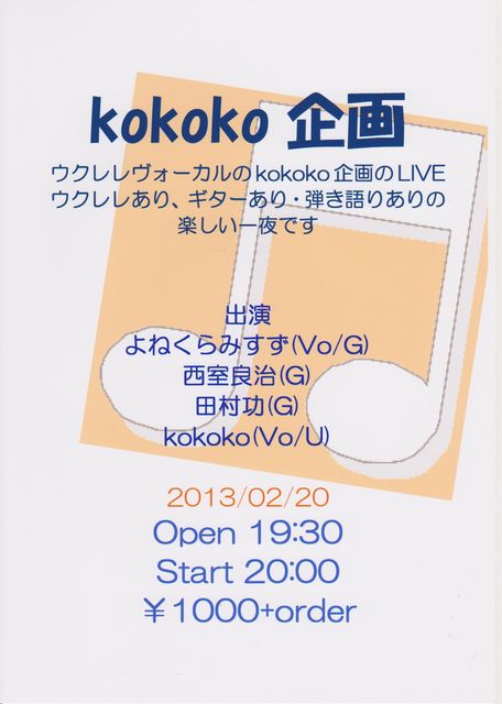 £²£°Æü¡Ê¿å¡Ëkokoko´ë²è ¤è¤Í¤Ã¤Ô(Vo/G) À¾¼¼Îɼ£(G) Åļ¸ù(G) kokoko(Pf/Uklele/Vo) Open;19:30 Start;20:00 ¡ï1000+drink