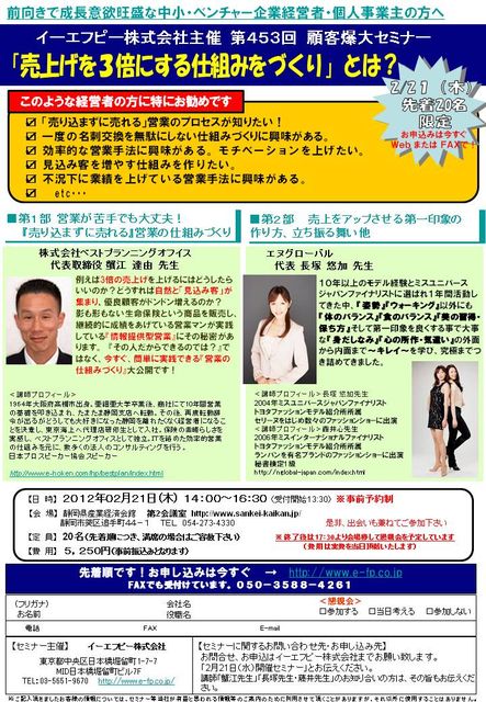 「売上アップに直結する情報発信術セミナーのお知らせ」 お世話になっております。 株式会社ベストプランニングオフィスの蟹江です。 この度、営業支援で有名なイーエフピー株式会社主催のセミナーで、私、蟹江 が講師を務めることになりました。全国各地で満員御礼が相次ぐ話題の「売れ 続けるしくみ」をテーマにお話させていただきます。是非お誘い合わせの上、 お気軽に参加いただけることを楽しみにしております。 ※お名前、会社名、役職名など間違いがございましたら、お教え下さい。 ※ご興味をお持ちの方に転送いただ