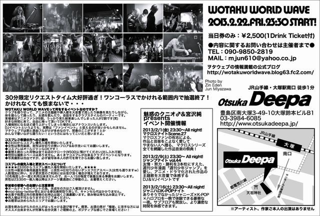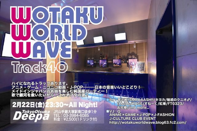 お世話になっております。 記念開催、皆さんと盛り上がれればと思います! “WOTAKU WORLD WAVE Track.40” - 祝・4周年&40回記念パーティー! - 日時:2013年2月22日(金) 23:30〜All Night! 会場:大塚Deepa 住所:東京都豊島区南大塚3-49-10大塚鈴本ビルB1 TEL:03-3984-6085 http://www.otsukadeepa.jp/ ---------------------------------------------- 当日:\2500(1Drink Ticket付き) ---------------------------------------------- ◆DJ◆ 宮沢純 SMAAAASH!! 魅惑のクニオ♂ キヨカ すねーく KAGE