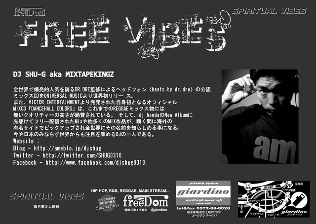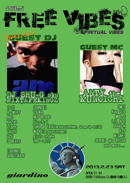 "Free Vibes" 2013.2.23.(Sat) @giardino 〒509-6101 岐阜県瑞浪市土岐町7931 ゴールデンパーク1F tel&fax 0572-68-8028 Open 21:00- Door 1500Yen ◆Special Guest DJ DJ SHU-G a.k.a MIXTAPEKINGZ ◆Guest MC ANTY the KUNOICHI ◆DJs A-SWIFT ARC KAZUO Light YASSY UZU 3 BEATS ◆Dancers TSUKA NEO BLOOD Piったく TAKA & YASU (Black Elephant, Grown Up Child) WU-KE (Black Elephant) girls shake TBP〜の!! ◆MCs Kay Gie MAD.S LIL ACE DOGG