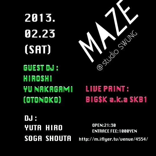 今回2013年一発目のMAZEは、 過去に「XAVIER MOREL」「Q'HEY 」等の国内外トップDJを当地に招致し、partyを成功させた、Hiroshiくん。 言わずとも知れた、名古屋老舗Techno Partyである「OTONOKO」より、YU NAKAGAMIくん。 昨年もLive Paintでの協力をしてもらい、ストリートに軸を置きながらも新しさ、新鮮さを追求している実験的なアーティスト、BIG$K a.k.a SKB1くん。 この三人を迎え、ローカル色満載な感じで開催します。 聴覚的、視覚的にも非日常なこの空間を是非体感してください。 http://iflyer.tv/event/123425/ MAZE @