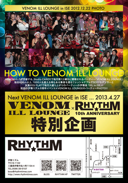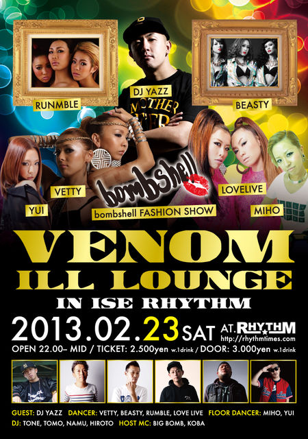 2月のベナムイルラウンジ伊勢の詳細も上がりましたよー ★VENOM ILL LOUNGE 伊勢★ 2013/02/23 (SAT) 会場:伊勢RHYTHM 〒516-1102 三重県伊勢市佐八町1154-4 bombshell FASHION SHOW GUEST DJ YAZZ DANCER VETTY/BEASTY/RUMBLE/LOVE LIVE FLLOR DANCER MIHO/YUI DJ TONE/TOMO/NAMU/HIROTO HOST MC BIG BOMB/KOBA 【時間】 22:00-midnight 【料金】 前売り2,500円(1drink付) 当日券3,000円(1drink付)