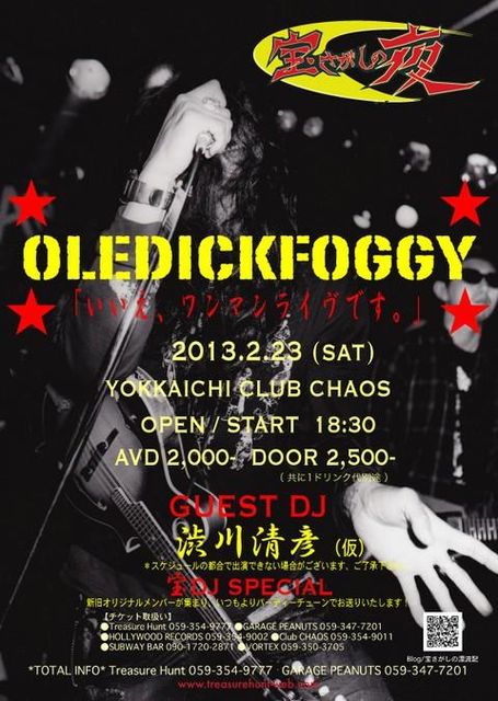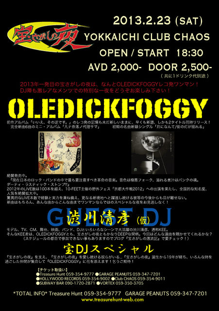 2013/02/23(sat) @Yokkaichi CLUB CHOS OPEN/START 18:30 AVD:2000/DOOR:2500(共に1ドリンク代別途) LIVE OLEDICKFOGGY GUEST DJ 渋川 清彦 (予定) 宝DJスペシャル(新旧オリジナルメンバー) MOO/TAKASHI / TORIMO / K★G / YASUYO Nr.Sin/Fuck!Hirata 次回宝さがしの夜はなんとOLEDICKFOGGYワンマン!! DJ陣も超豪華!! お楽しみに!!