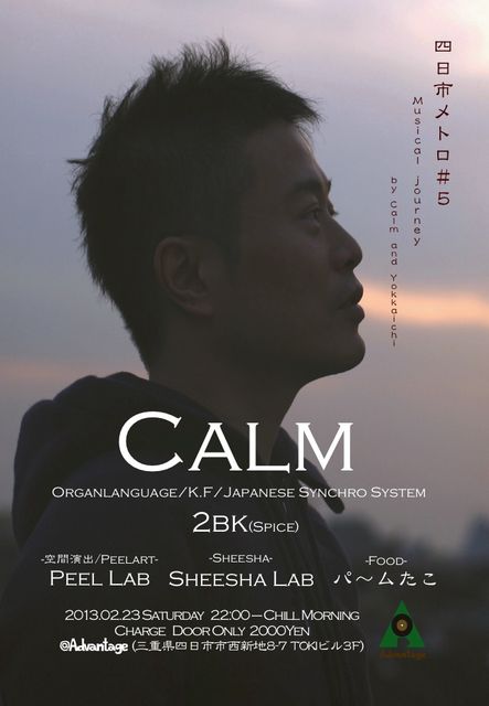 管理人様誠に恐れ入りますが告知失礼いたします。 『Calm』三重県四日市でのロングプレイナイトが決定!2/23@四日市Advantage!!!! 『四日市メトロ#5 -Musical journey by Calm and Yokkaichi!!-』 【日時】 2013年2月23日 22:00 - Chillmorning 「年に2回と定期的にパーティーを行っている四日市にまたまた参戦!今回は聴きごたえ、踊りごたえ十分なロングセットプレイをします。オープニングの相棒は地元の信頼おける2bkにお任せしてます。今面白いのは大都市ではなく、こういった中規模都市だということを実感できるパーティーになると思