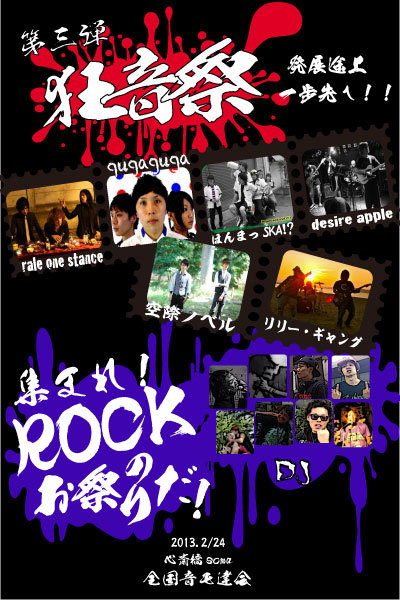 第三弾狂音祭〜発展途上一歩先へ〜 遂に第三弾! レーベル持ちのバンドが多数出演!!! 今を駆け巡る超注目バンドばかり!! 場所は大阪心斎橋soma キャパ360人!! またDJ陣もフロアを盛り上げる曲をご用意しております!! そんなノンストップな音楽溢れるイベント・狂音祭!! 狂音祭HP:http://kyo-on-sai.net/mobile.html 【日時】 2013年2月24日(日) 【場所】 大阪心斎橋soma アクセス:http://www.will-music.net/sm_floor_map/index.html OPEN 15:00 CLOSE22:30 【チケッ