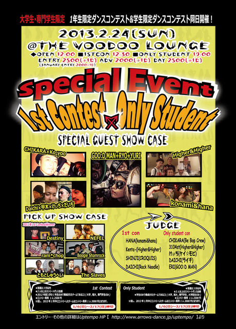 ³ØÀ¸¤Î³§Íͤإ¤¥Ù¥ó¥È¤Î¤ªÃΤ餻¤Ç¤¹¡£ ¡Ú¶å½£¤Î³ØÀ¸¥À¥ó¥µ¡¼É¬¸«¡Û º£Ç¯¤Ï¥¹¥Ú¥·¥ã¥ë³«ºÅ¤Ç¤¹¡ª¡ª 1¥³¥ó¤È¥ª¥ó¥ê¡¼¤ÎƱÆü³«ºÅ¡ªÍ×¥Á¥§¥Ã¥¯¤Ç¤¹¤è¡£ ¢¡2013.2.24(sun) ¡ÚSpecial Event¡Û1st Contest ¡ß Only Student Contest ADV:2000yen(+1D) DAY:2500yen(+1D) ENTRY:2500yen(+1D) (1·îÃæ¤Î¥¨¥ó¥È¥ê¡¼¤Ï2000yen(+1D)) OPEN 12:00 START 12:30 ¢¡¢¡ENTRY¢¡¢¡ ¡Ø1st Contest¡Ù ¢¡²»¸»¤Ï3ʬ°ÊÆâ ¢¡2¿Í°Ê¾å¤Î¥¹¥È¥ê¡¼¥È¥À¥ó¥¹Á´ÈÌ ¢¡2012 ǯÅÙÆþ³Ø¤Î1ǯÀ¸¤Î¤ß¤Ç¹½À®¤µ¤ì¤¿¥Á¡¼¥à¤Ç¤¢¤ë¤³¤È(Âç³Ø,ûÂç,ÀìÌç
