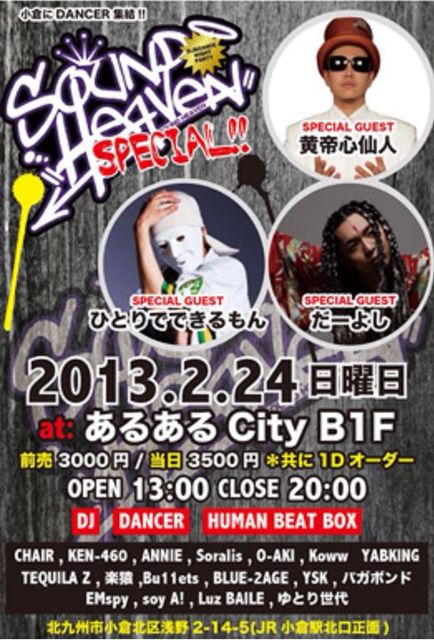 ¡ã¡¡£²£°£±£³Ç¯£²·î£²£´Æü¡¡ÆüÍËÆü¤Ç¤¹¡ª¡¡¡ä SOUND HEAVEN Special !!! ¥¹¥È¥ê¡¼¥È¥À¥ó¥¹¤È¥¢¥Ë¥á¤¬Íí¤ó¤À°Û¿§¥¤¥Ù¥ó¥È¡ª ¤¢¤ë¤¢¤ëCity B£±F ¥¤¥Ù¥ó¥È¥¹¥Ú¡¼¥¹ Ë̶彣»Ô¾®ÁÒË̶èÀõÌî2-14-5(JR¾®ÁÒ±ØË̸ýÀµÌÌ) ¡úOpen ¡¡£±£³¡§£°£° ¡úClose¡¡ £²£°¡§£°£° ¡üÁ°Çä £³£°£°£°±ß £±DrinkÉÕ¤ ¡üÅöÆü £³£µ£°£°±ß £±DrinkÉÕ¤ (ºÆÆþ¾ì¤ÎºÝ¡¢¥¹¥¿¥ó¥×or¥¤¥ó¥·¥å¥í¥Ã¥¯