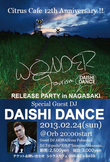 シトラスカフェ12周年を記念して盛大にPARTYを開催します!! 4thアルバムを発売したDAISHI DANCEが8回目の来崎!! 皆様!!大大集合よろしくお願いします!!!!!!! Citrus Cafe 12th Anniversary DAISHI DANCE"WONDER Tourism"RELEASE PARTY! @Orb長崎 2013.2.24(sun)20:00start Special Guest DJ : DAISHI DANCE Guest DJ.AKIRA(from Fukuoka) DJ.T@guchi*S.O.F*hiragino*Akanami 前売:2,500yen 当日:3,000yen(1Drink Order) ※別途ドリンク代500円をご用意くださいませ チケットお問い合わせ シトラスカフェ 095-823