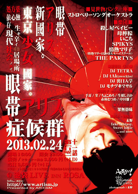 ■東京眼帯アリス症候群11 □2013.02.24(sun) □Open&Start 16:00 Close 22:00 □予約:\3000 (+1D) 当日:\3500 (+1D) ※学割:18歳以下は1000円割引(年齢の分かる身分証明書提示) □池袋LIVE INN ROSA(03-5956-3463) 〒171-0021 東京都豊島区西池袋1-37-12 ロサ会館B2F ■見世物パンク一座■ ストロベリーソングオーケストラ ■樂団■ 殺し屋ベイビー 母檸檬 いこち SPIKYS 情熱マリ子(情熱マリーとしゃぼん玉ハイスクール) THE PARTYS ■選樂員(DJ)■ DJ TETRA/DJ tAk (zwecklos)/DJ 裏口入学/DJ モチヅキマ