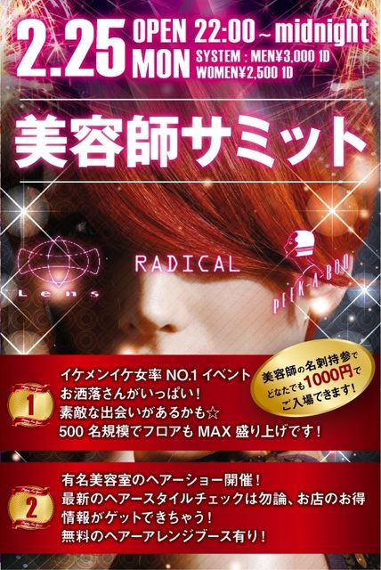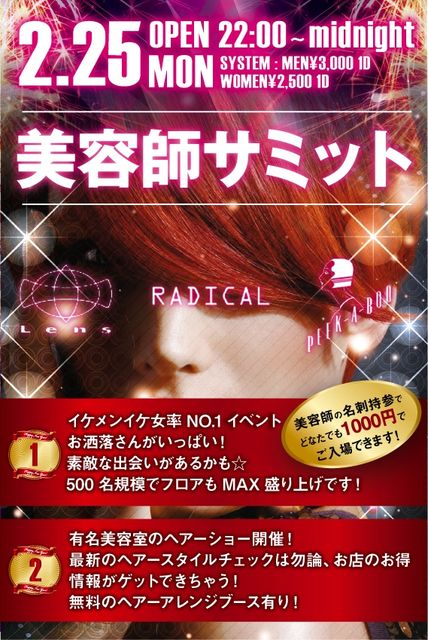 2/25 (月) 早急に入られたい方メッセージが苦手な方 入り口で五十嵐ゲストのビヨウシと言っても最安ディスカウント対応可能です 最安の男性2000/1D,女性1500/1Dでご招待します 渋谷キャメロットにて毎回500人 お洒落ボーイ、お洒落ガール率NO.1イベントです 今回は 3店舗のヘアーショー RADICAL PEEK A BOO Lens 1 美容師による簡単に可愛くなれるセット術口座が多数公開 2 ヘアーアレンジブースが無料!有名美容室によるヘアーショーやアレン