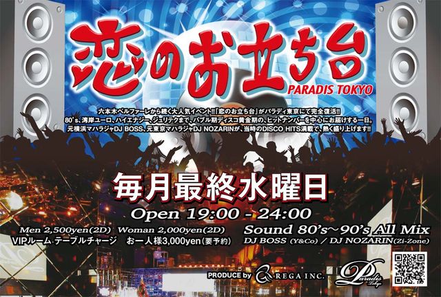 あの伝説のイベント♪♪ 【☆★ 恋のお立ち台 FINAL ★☆】 毎月最終水曜の大好評イベントが今月でな、なんとラストとなってしまいました(泣) もうこのサウンドは聞けないかも!? 最後に当時の盛り上がりを体験しにきませんか? ・DJ BOSS(元横浜マハラジャ) ・DJ NOZARIN(元東京マハラジャ) ...and more... ■19:00 Open - 24:00 Close 六本木 ParadisTokyo ■男性2500円/2ドリンク ■女性2000円/ 2ドリンク ★VIP1名5000円/食事、ドリンク別途(伝票制) ※2時間制(混雑時) 最大10名様まで対応のカ