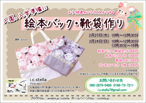布で子供服や雑貨を手作りされているgrooveさんが絵本バック、靴袋作り教室をします! 2月27日(水) 10時〜12時半 3月24日(日) 10時〜12時半 13時〜15時半 絵本バック、靴袋セット3000円 絵本バックのみ 1800円 靴袋のみ1500円 ランチョンマット 2枚 1000円 その他相談 生地とミシンはこちらで用意いたしますが 持込も可能です お気軽にお問い合わせください i.c.stella7@gmail.com 09028790489 0166737211 MIXI ページ http://page.mixi.jp/view_page.pl?page_id=272322 ネットSHOP http