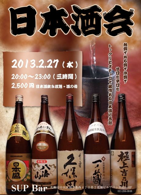 【日本酒会@SUP Bar】 真冬の寒いこんな時は、 熱燗でぬる燗で冷燗で 辛口を甘口を トックリとオチョコで風情ある日本酒に舌鼓(談 盛り上げ本部長 SUP Bar bebe) 2013.2.27 (水) 20:00〜23:00 3時間日本酒飲み放題+【酒の肴】 ※肴の持ち込み可能です。 2,500円 SUP Bar(サップバー) -Lighting Wizard(ライティング ウィザード)- http://www.youtube.com/watch?v=ybm9fvAWkSk 札幌市中央区南7条西4丁目第2北海ビルアバンティー6F 011-206-0848 「毎日がエンターテインメント!(Every day is entertainm