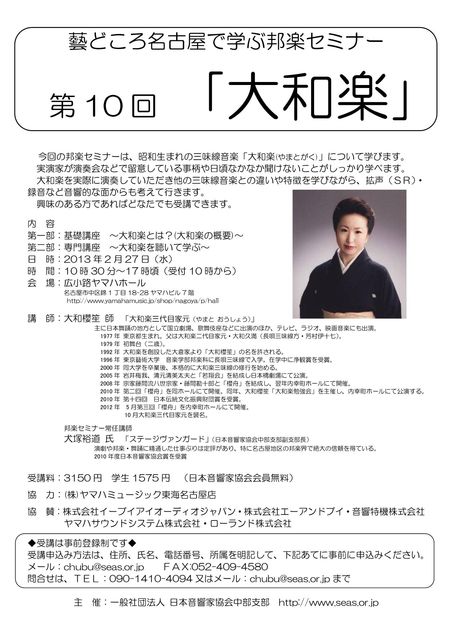 日本音響家協会中部支部主催 昭和生まれの三味線音楽「大和楽」について学びます。 大和楽三代目家元・大和櫻笙先生他演奏者の方々をお招きし、実際に演奏して頂き他の三味線音楽との違いや特徴を学びながら、拡声(SR)や録音など音響的な面からも考えて行きます。 演奏家の方々が演奏会などで留意している事柄や日頃仲々聞けないことなどがしっかり学べます。