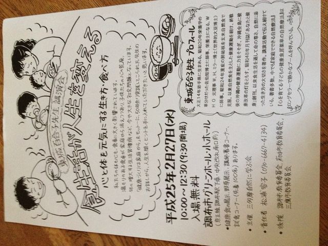 2月27日水曜日に調布にて東城先生の講演会が開催されます。 『食生活が人生を変える』 ところ:調布グリーンホール・小ホール 時間:10時〜12時半(9時半開場) 入場無料(先着順) ※試食コーナーあり(先着100名様) 問合せ先:三多摩自然に学ぶ会・松浦容子さん(070-6667-4134)