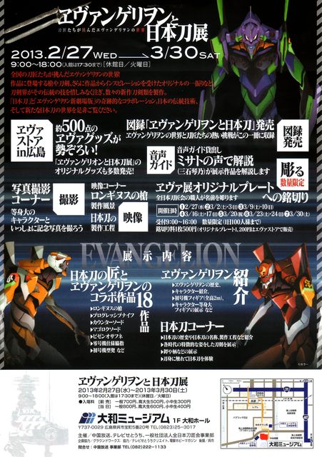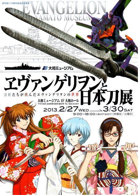 RCC中国放送 ヱヴァンゲリヲンと日本刀展 http://www.rcc.net/event/2013/evangelion.htm 連合艦隊の聖地での開催であります∠(・_・) −−−−−−−−−−−−−−−−−−−−−−−−−−−−−−−−−−−− 「エヴァ展」の呉開催決まる - 中国新聞 http://www.chugoku-np.co.jp/News/Tn201301240039.html 備前長船刀剣博物館(瀬戸内市長船町)で大人気となった「ヱヴァンゲリヲンと日本刀展」が、呉市の大和ミュージアムに巡回することが決まった。市制110周年記念協賛事業として、2月27日から3月30日まで開催され