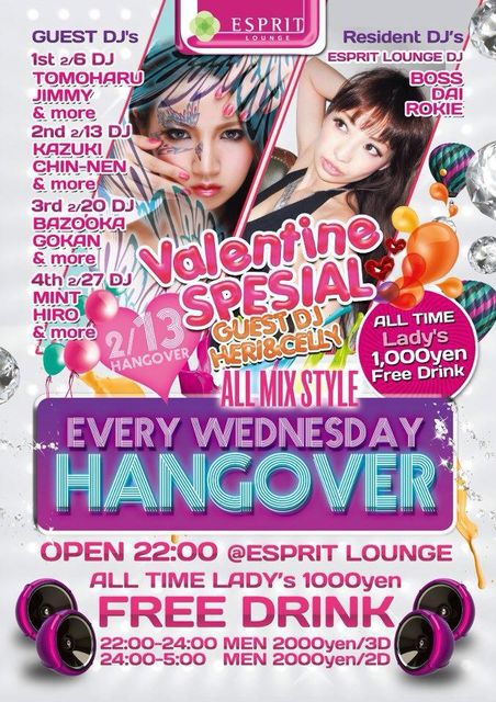 告知失礼致します。 明日2/27(水)は六本木ESPRIT LOUNGEにて、 『HANGOVER』 開催します! ★以下詳細★ 毎週水曜"HANGOVER"女性FreeDrink 六本木NEW GIRLS SPOT【ESPRIT LOUNGE】 六本木に超豪華空間 天高7メートルの吹き抜けを有する、超ラグジュアリー空間 六本木ESPRIT LOUNGE(エスプリラウンジ) 六本木NEW GIRLS SPOT女の子の新定番 飲み放題のHANGOVER(ハングオーバー) MUSIC はオールミックスでお届け 定番曲はもちろん懐かしの名曲、最新HITのダンスミュージックからロックやポップスまで幅広い選曲で朝まで