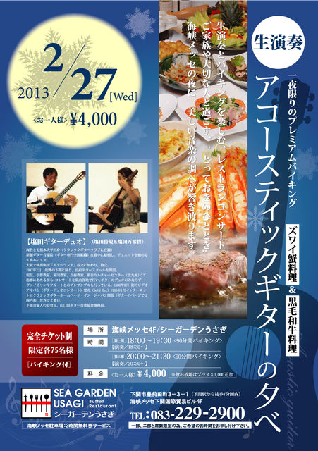 2月27日シーガーデンうさぎ「アコースティックギターの夕べ」予約受付中!ズワイガニ料理・黒毛和牛料理他スペシャルバイキング 。完全チケット制ですので店頭にてご購入下さい。 チケット代4,000円 飲み放題は1,000円 お問い合わせ 下関市豊前田町3-3-1 海峡メッセ下関国際貿易ビル4F TEL083-229-2900