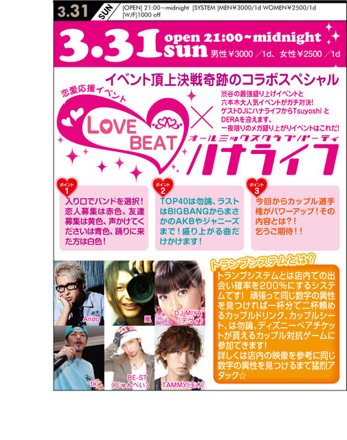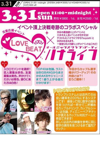 受付でDJサトルのゲストのビートと言えばゲスト料金の男性2000円、女性1500円になります! 超話題の恋愛応援イベントLOVE BEAT 毎回参加者1000人を超え、豪華ゲストやサプライズもありお騒がせなこのイベント 今回は六本木の大人気イベントのハナライフからTsuyoshiとDERAを迎えてお送りします ツイッター(フォローしてね) https://twitter.com/#!/lovebeat_kitene ラブビートブログ(写真も載っています) http://ameblo.jp/lovebeat-kitene/ 入り口で4種類のカラーバンドをそれぞれの目的に応じて選択 トラン