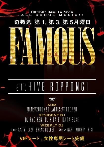 管理人様告知失礼します。 エントランスで、 ★★★★★★★★★★★★★★★★★★★★★★★ 「タイスケのゲストでフェイマス」 ★★★★★★★★★★★★★★★★★★★★★★★ と言って頂ければ、何名様でもゲスト料金でご入場頂けます。 男性 1000YEN/1D 女性 1000YEN/4D のゲスト料金です。 また個別にでもゲストお取りできますので、メッセージください。 宜しくお願いします。 3/18(月)「FAMOUS」@六本木HIVE OPEN:23:00 CLOSE:5:00 RESIDENT DJ: RYO-KEN K.DA.B TAISUKE PICK UP DJ:
