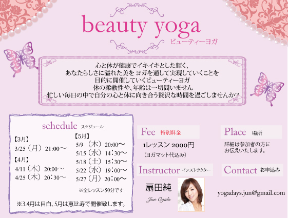 キラキランチを一緒に主宰している扇田純さんによるヨガレッスンの第2回です 25日は平日の夜開催なのでお仕事帰りに是非ご参加下さい 春にむけて、ヨガでリフレッシュしませんか? ヨガ未経験、体が硬い方でも気軽にご参加ください ヨガでは、たくさんのプラスな効果が期待できます リラックス効果、シェイプアップ効果、代謝アップや筋力向上、体幹を鍛える効果など 心がリフレッシュすると、前向きなマインド、体もイキイキと元気になります 心と体はつながっていることを実感してください