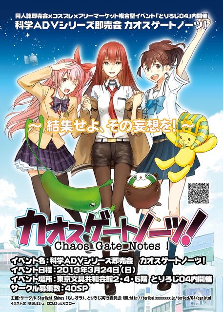 科学adv系のコミュは多々ありますが、 ここの人数が最も多いため、 宣伝用イベントスペースをお借りします。 来る3月24日(日)、共栄文具会館で行われるイベント、 「とりろじ」内にて、科学アドベンチャーオンリー即売会、 「カオスゲートノーツ!」が開催されます! 妄想をリアルブートする瞬間が遂に来ました! 科学advを愛する皆様、奮ってご参加ください! 複合型イベント「とりろじ」 http://torilozi.xxxxxxxx.jp/ ・イベント名 : 科学ADVオンリー同人誌即売会 「カオスゲートノーツ!」 http://torilozi.xxxxxxxx.