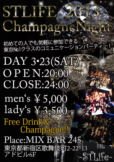 【新宿】3.23(SAT)20:00〜24:00≪アットホームなシャンパンパーティー≫ ★★★2013年3月23日(SAT)  STLIFE Champagne Night 2013★★★ パーティーコンセプト【絆】 こんにちわ、Event Presenter浅倉隆史です(*ゝω・*)ノ『コンチャ』 季節はすっかり春ですね〜(。≧ω≦)ノ『コンチャ!!』 上がりっぱなしのクラブイベントもいいですが 正直あんまり得意じゃない…って方少なくないですよね? まったりシャンパンを飲みながら会話なんて如何でしょうか?(^_-) 今回前半はしゃべりをメインにしアットホームなパーティーを