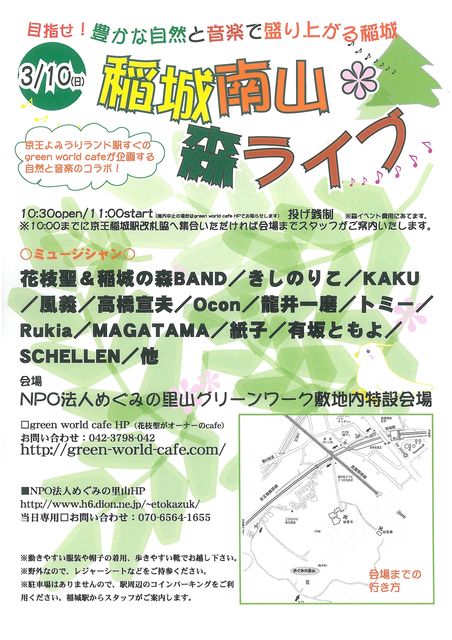 去る1月30日の読売新聞多摩版に大きく取り上げられました、green world cafe森ライブ実行委員会主催の森ライブがいよいよ3週間後の開催となります。 森の中で響き渡るLIVE音は格別なものがあります。 新しい芽吹きの香りもただよう環境で、素敵な音楽に包まれてみませんか? お子様連れも大歓迎です。 ■詳細:イベント名【森ライブ】 ■日時:2013年3月10日(日)開場10:30 開演11:00 閉演15:00予定 入場無料 パフォーマンスが気に入りましたら、お気持ちを投げ銭してください。経費を差し引いた分は