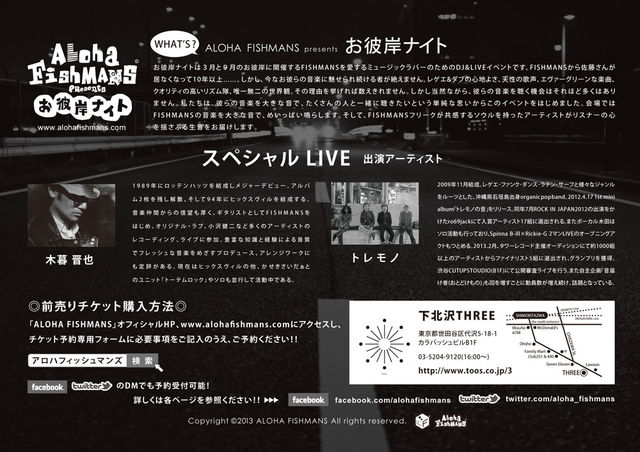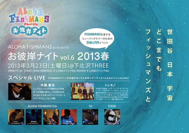 (管理人様、告知失礼いたします。) こちらのコミュニティで日頃お世話になっているくるりんと申します。 年に2回のお彼岸の時期におこなっているフィッシュマンズのDJ&ライブイベント「お彼岸ナイト」のご案内です!! ------------------------------------------------------------------------------------------------ 「ALOHA FISHMANS presents お彼岸ナイトvol.6 2013春」 お彼岸ナイトは3月と9月のお彼岸に開催するFISHMANSを愛するミュージックラバーのためのDJ&LIVEイベントです。 FISHMANSから佐藤さんが居