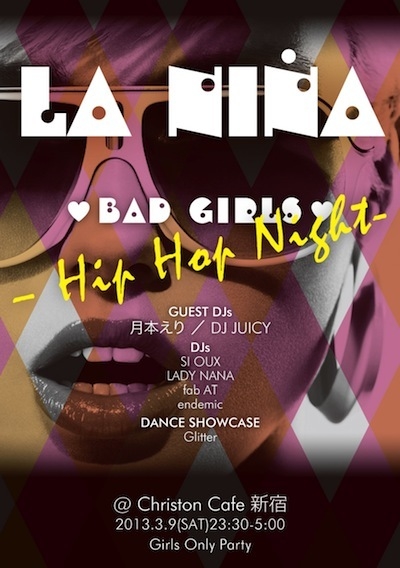 貴重なスペースをお借り致します。 LA NINA 2013. 03. 09 (SAT) ハート BAD GiRLS ハート - HIP HOP NIGHT - @Christon Cafe Shinjuku --------------------- 新たなムーブメントを発信し、TOKYOの新しいパーティーシーンを盛り上げる、女のコによる女のコのための最先端ガールズオンリーパーティー"La Nina” Love Girls, Fashion & Music、女の子と仲良くなりたい女のコのためのハイエンドでカッティングエッジなガールズパワー炸裂のParty Night☆ 3月のLa Nina はヒップホップ・ナイトを開催exclamation HIP HOP, R&Bに強い 月本え