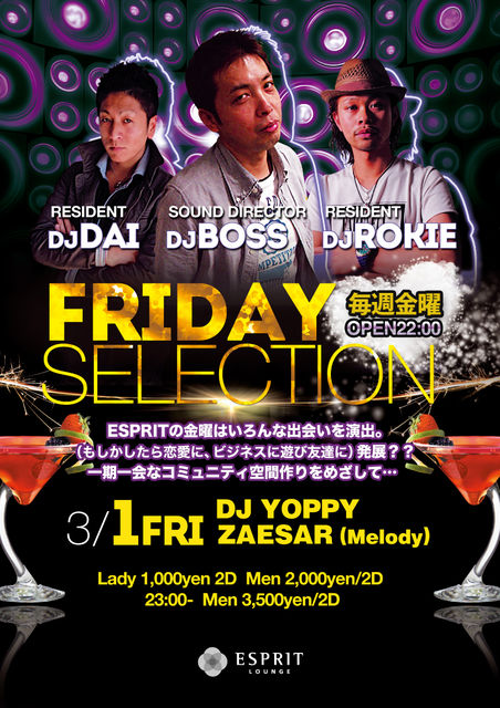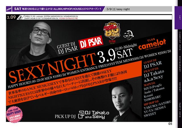 世界基準のDANCE MUSICとSEXYで多彩なGUESTを迎えて開催のSEXY NIGHT!!GUESTには世界中の様々な巨大パーティーに出演し、その無類の才能により各国で大絶賛を浴びているベルギー出身のヨーロッパのトップDJでDJPSARが登場!!!!!! SYSTEM MEN¥3500/2d WOMEN¥2500/2d HAPPY HOUR 21:00〜23:00(MEN¥1000/2d WOMEN ENTRANCE FREE) GUEST DJ Psar (Bergie) MAIN DJ : U5(Prog5) / Ando / KOTANI / Takato aka Sexy HIPHOP DJ : TAKUMA / SATORU / YU-TA / SENSUI / SWEEET ※ ご入場の際は写真付き身分証明書が必要です。(入場の際に