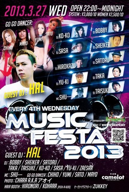 管理人様告知失礼します。 エントランスで、 ★★★★★★★★★★★★★★★★★★★★★★★ 「タイスケのゲストでキャメロット」 ★★★★★★★★★★★★★★★★★★★★★★★ と言って頂ければ、何名様でもゲスト料金でご入場頂けます。 男性、 2000YEN/1D 女性は、 1500YEN/1D のゲスト料金です。 また個別にでもゲストお取りできますので、メッセージください。 宜しくお願いします。 3/27(水)「MUSIC FESTA」@渋谷camelot OPEN:22:00 CLOSE:5:00 GUEST DJ: HAL DJ: