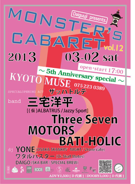告知失礼致します。 3月「京都」ライブ ■MONSTER'S CABARET■ 〜 5周年スペシャル !!! 〜 2013/3/2(土) PM17:00 開場・開演 【会場】 KYOTO MUSE (京都市下京区四条通柳馬場西入ル) 【LIVE】 ■三宅洋平 ((仮)ALBATRUS) ■Three Seven ■BATI-HOLIC (和太鼓ROCK) ■MOTORS ●SPECIAL OPENING ACT !!!● ■ザッハトルテ 【DJ】 ■YONE (OSAKA SKANKIN' NIGHT / 2tone cafe) ■ワタルバスター (Oi-Skall Mates) ■DAIGO (SKA BAR / SPECIAL BREW) ●●●チケット●●● 前売¥2