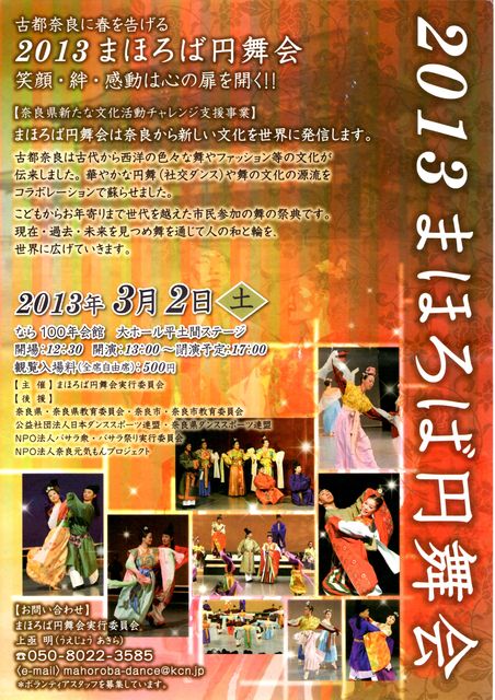 管理人様。この場をお借りして告知させて頂きます。 ☆古都奈良に春を告げる ”2013まほろば円舞会” 笑顔・絆・感動は心の扉を開く!!☆ 1幕 まほろば王国宮廷舞踏会ダンスファンタジー いろんなジャンルのダンスを取り入れ、ダンスだけでストーリーを展開していきます! 主役のダンスは、もちろん社交ダンス♪ 太鼓の生演奏に併せてのタンゴや、多団体との合同で30名以上でのフォーメーションなど、見どころは盛り沢山です★ 2幕 Shall We ダンス?―ダンスパフォーマンス― 2幕は、1幕に出演された方も含め、多ジ
