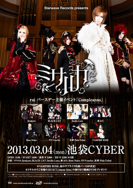 2013年3月4日 池袋CYBER ミサルカ rui バースデー主催イベント「Compleanno」 Starwave Records presents OPEN: 15:30 / START 16:00 前売 \ 3,000 / 当日 \ 3,500 ※D別 出演:ミサルカ、Synk;yet-シンクイェット-、BLACK CAT、Secilia Luna、蒼-AO-、Rose Noire、ゼクス-zechs-、狂華 Pink-Tribal ※VAMPIRE ROSE、血のサプライズ出演パート2が決定! ※ミサルカでご来場の方には「L'oiseau blue」の振り付け動画DVDをプレゼント! チケット ■A:2013年1月28日 池袋サイバー ミサルカ物販で発売開始(No.1〜50シャッフル) ■B
