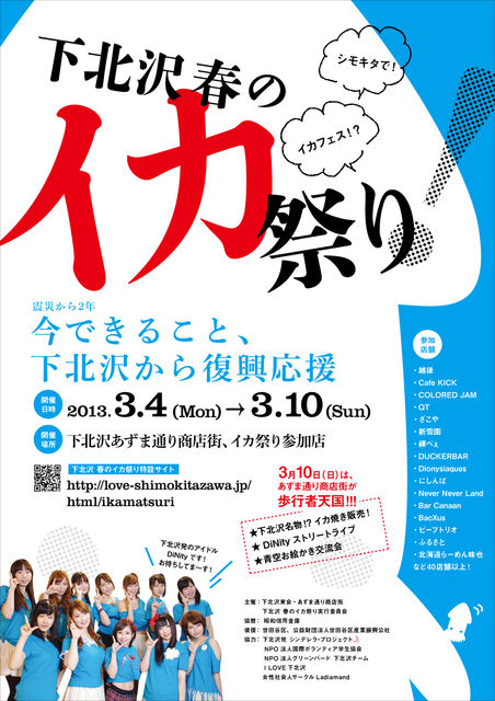 2013.3/4(月)〜3/10(日)まで、下北沢の飲食店でイカを食べて街を盛り上げる「下北沢 春のイカ祭り」が開催されます。 期間中に44店の参加店舗でイカをたくさん食べると、オリジナルステッカーや産直品をプレゼント!さらに、イカ祭り最終日の3/10(日)は、あずま通り商店街を歩行者天国にして、被災地女川漁港から届けられた、水揚げされたばかりの新鮮なイカを使ったイカ焼きの販売や、お絵かき交流会やストリートライブなど、楽しいイベントを開催します。 イカ祭り公式サイト http://love-shimokitazawa.jp/html/ikamatsuri