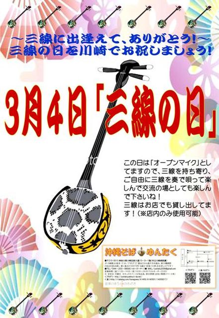 3/4(月)は三線の日なので、是非、三線片手に「ゆんたく」へ遊びに来て下さいね! 三線と歌のオープンステージなので、お気軽に奏でに是非ご来店!
