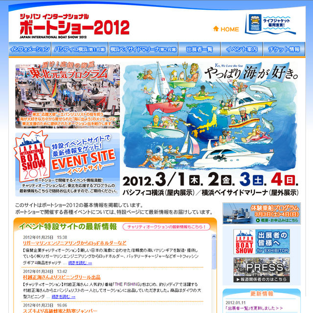 ジャパンインターナショナルボートショー2012 幹 ライブ・届け!応援の海風 [日時] 2012/03/04(日) 時間未定 [場所] パシフィコ横浜 (神奈川県横浜市西区みなとみらい1-1-1) http://www.pacifico.co.jp/ 東北支援企画のライブステージに出演します。 http://www.marine-jbia.or.jp/boatshow2012/