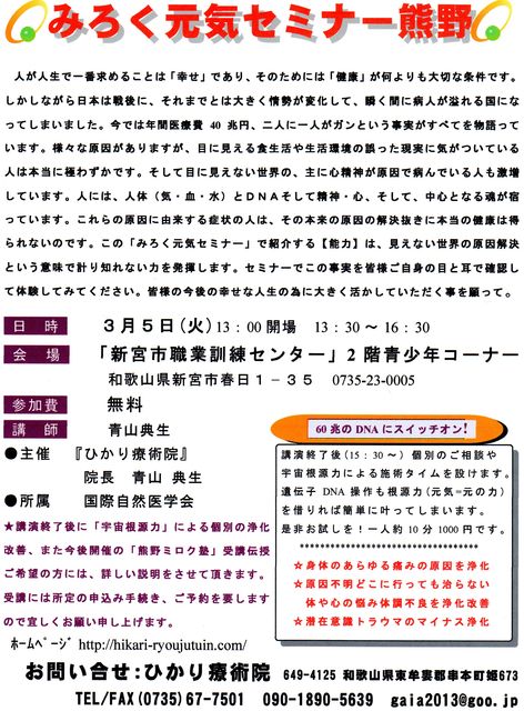 日 時 3月5日(火)13:00開場 13:30〜15:30 会 場 「新宮市職業訓練センター」2階青少年コーナー 和歌山県新宮市春日1−35 0735-23-0005 参加費 無料 講 師 青山典生 ●主催 『ひかり療術院』 院長 青山 典生 ●所属 国際自然医学会 人が人生で一番求めることは「幸せ」であり、そのためには「健康」が何よりも大切な条件です。しかしながら日本は戦後に、それまでとは大きく情勢が変化して、瞬く間に病人が溢れる国になってしまいました。今では年間医療費40兆円、二人に一人がガンとい