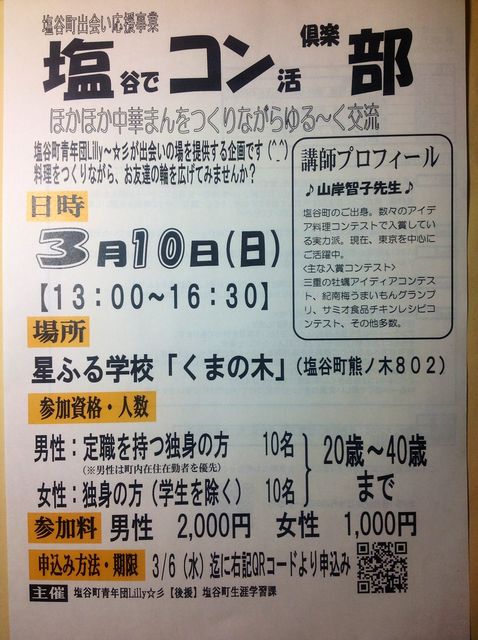 〓〓〓〓〓〓〓〓〓〓〓〓 塩谷町出会い応援事業 (塩)谷で、(コン)活、倶楽(部) ★『塩コン部』 (´・ω・)ほかほか中華まんをつくりながらゆる〜く交流(・ω・`) 塩谷町青年団Lilly☆彡が出会いの場の提供する企画です。 料理をつくりながら、お友達の輪を広げませんか? ★日時: 平成25年の3月10日(日) 13:00〜16:30 (3時間30分) ★場所: 星降る学校「くまの木」 (塩谷町熊ノ木802) ★参加資格・人数(先着順): 男性:10名【20歳〜40歳までの定職についている独身者(塩谷町内在住者及び在勤者