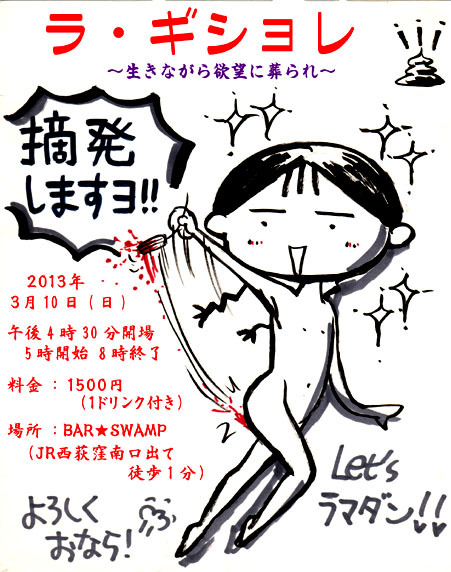 はじめまして、主催のコーチといいます。 昨年に続いて、今年も開催します♪ 東日本大震災チャリティー企画 『2013・がんばれ日本! アニカラ・チャリティーオフ会』 2011年3月 11日の震災から2年が過ぎようとしています、 未だに被災地復興の道のりには時間がかかりそうですが 微力ながらも復興のお手伝いができればいいなと。 皆で明るく楽しくアニソンを歌って元気をもらいましょう♪ そしてその元気で世の中を動かし景気をUPしましょう♪ そうなれば復興支援のスピードも上がるでしょう♪ だから、アニソンを皆で楽し