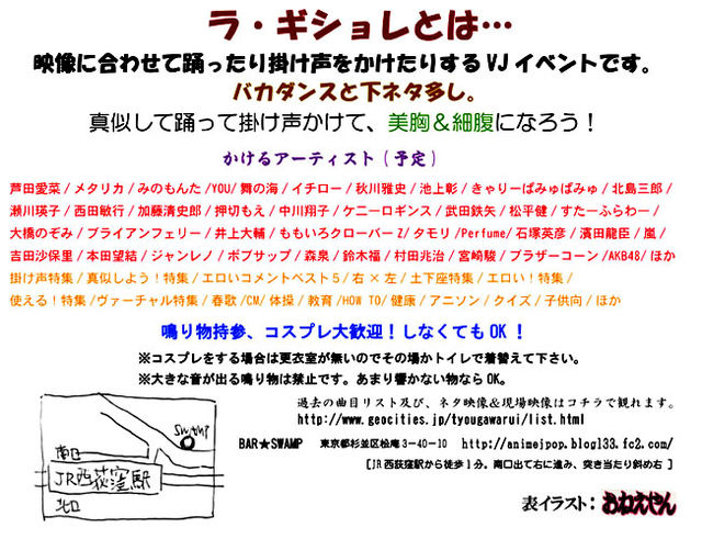 料金:1500円(1ドリンク付き) かけるアーティスト(予定) メタリカ/中居正広/芦田愛菜/石川楓子/みのもんた/松平健/舞の海/ブルーマン/石川秀美/ももいろクローバーZ/中川翔子/すたーふらわー/秋川雅史/布施博/木梨憲武/押切もえ/柊まいん/北島三郎/YOU/西田敏行/加藤清史郎/嵐/大島美幸/瀬川瑛子/アニマル浜口/武田鉄矢/森田雪/ボブ・サップ/小林亜星/アグネス・チャン/ケニー・ロギンス/イモトアヤコ/ブライアン・フェリー/タモリ/鈴木史郎/ふかわりょう/石川遼/ジャン・レノ/ドクター中松/東MAX/森永卓郎/大橋のぞみ/吉田沙保里/ジャパネッ