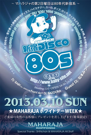 『SHINPACHI新宿DISCO80s』☆MAHARAJAホワイトデーWEEK☆ 今年も毎回満員御礼m(__)m 『SHINPACHI新宿DISCO80s』 ☆MAHARAJAホワイトデーWEEK☆ 3月10日開催です。 ご来場の女性のお客様にプレゼントを差し上げます ノリは勿論80年代新宿系(^^)v 3/10(日)18時半より六本木マハラジャに大集合! ▼ディスカウントゲスト登録24時間受付中▼ ディスカウント料金でご入場出来る、ゲスト登録を24時間受付中です。 メール送信で、 1.開催日、2.お名前(フリガナ)、3.人数 をお伝え下さい。 初めての方も、お一人様から
