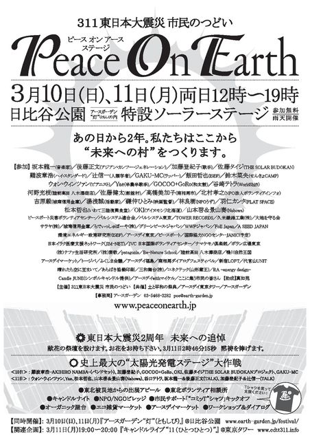 3月9日更新 コメント113をご覧ください! お待たせしました♪ 集合場所 集合時間 お知らせします ★集合時間 12:00 ★集合場所 東京都千代田区日比谷公園1-6 http://www.tokyo-park.or.jp/park/format/index037.html 日比谷公園内 にれの木 広場(ステージ反対側の位置にあります) 中幸門 幸門(交番付近)からが近いです。 http://www.peaceonearth.jp/IMG/poe13_panf.pdf それでは皆さま 気をつけてお越しください! 東北の復興に祈りをこめて思いを届けましょう。