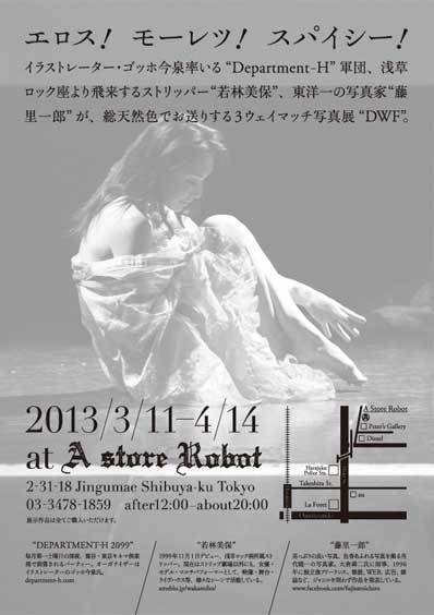 エロス!モーレツ!スパイシー! イラストレータ−・ゴッホ今泉率いる”Department-H"軍団、浅草ロック座より飛来するストリッパー”若林美保”、 東洋一の写真家”藤里一郎”が、総天然色でお送りする3ウェイマッチ写真展”DWF" 開催日:2013年3月11日(月)〜4月14日(日) 場所:A STORE ROBOT(アストアロボット)渋谷区神宮前2-31-18 ・プロフィール 「DEPARTMENT-H 2099」 毎月第一土曜日の深夜、鴬谷東京キネマ倶楽部で開催されるパーティー。オーガナイザーはイラストレーターのゴッホ今泉氏。department-h.com 「若林美保」